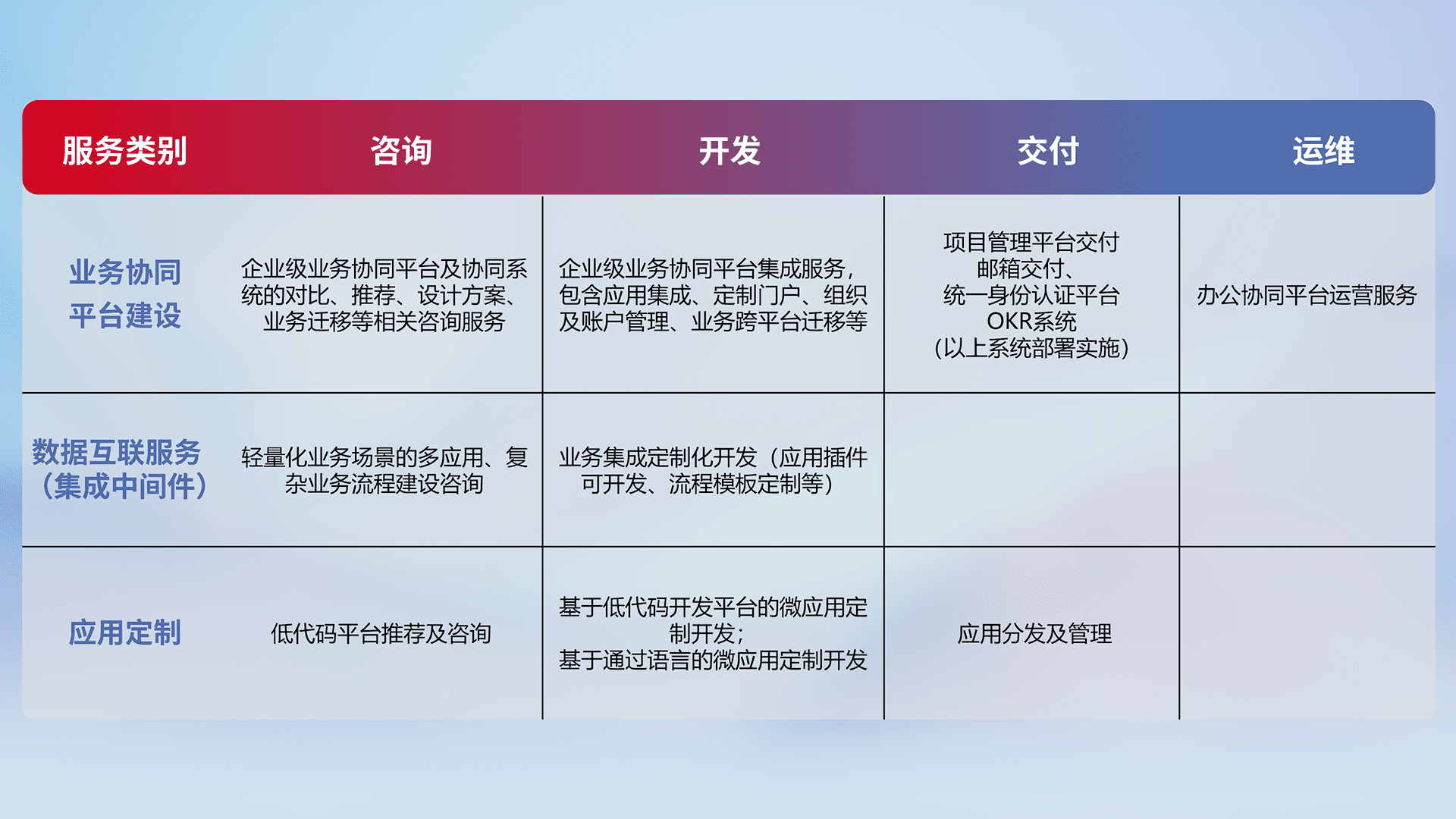 针对钉钉、、企微、、IDaas等平台级产品提供产品的规划、、方案、、交付、、、、定制化开发等服务,,,实现如统一协同办公、、、、智能客户服务、、、、混合会议管理、、、智能数据查询、、、、等业务场景,,,实现数字化转型。。
